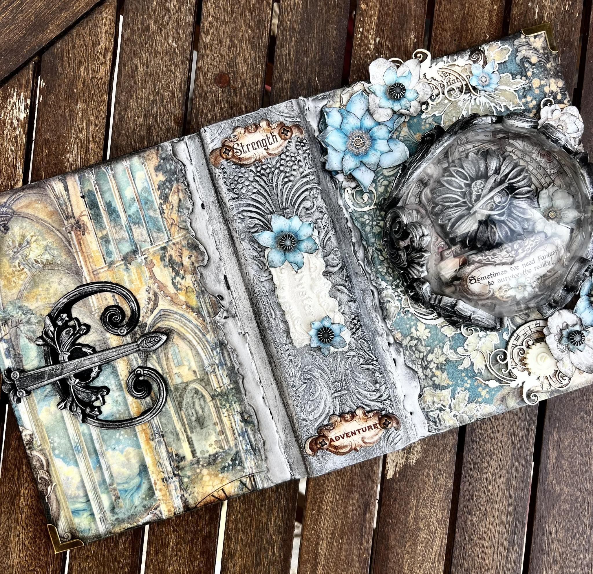 One last repeat.....This workshop uses Antonis' latest Sir Vagabond in Fantasy World collection from Stamperia too take you to a fantasy world full of surprises. We will be using hot glue gun techniques, moulds, creating flowers and more on this Chipboard album cover. PROJECT DESIGNED BY ANTONIS TZANIDAKIS.