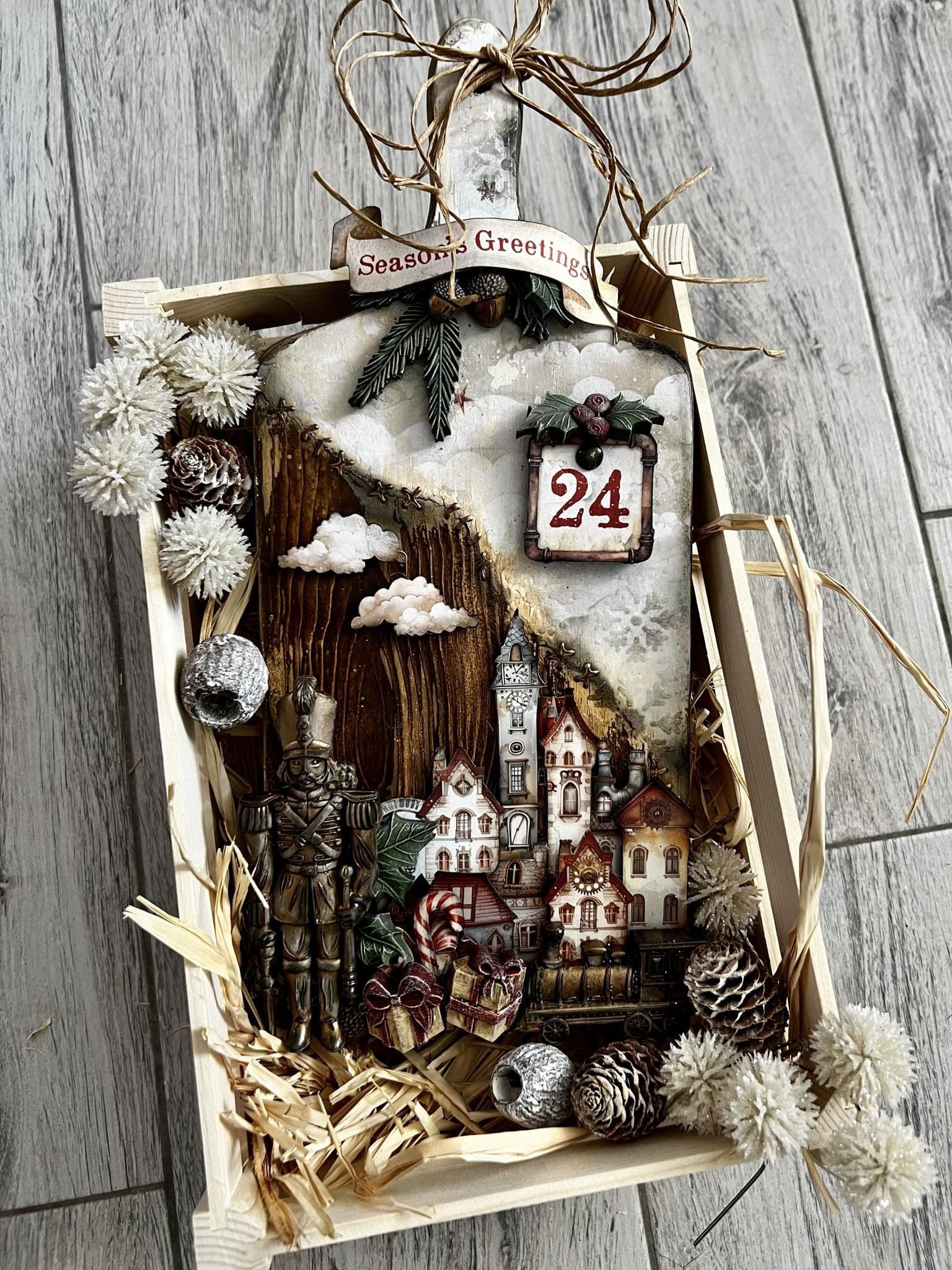 This project is a functional project, it has a calendar that you can actually count down the last 24 days until Christmas! In this beautiful project we are going to work with the amazing new Christmas Collection by Stamperia “Gear Up For Christmas” The special technique of this project is the Realistic Vintage Wooden texture, that we are going to create with the Wood Grain tool! Scrapbook papers blended with paints and stitches. Stencils with glitter and more , will bring this project to life! Created on a wooden chopping board approximate size 32 x 14cm. This workshop includes materials and refreshments on a help yourself basis. Please bring a basic tool kit. PROJECT DESIGNED BY ANTONIS TZANIDAKIS.