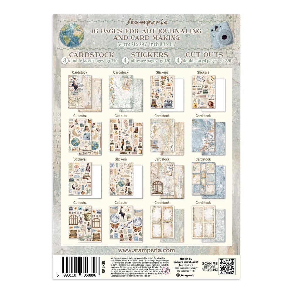 The Junk Journal includes 16 pages: 8 double faces pages CARDSTOCK - gr 220; 4 Adhesive pages STICKERS - gr 120; 4 double faced pages CUT OUTS gr 220.