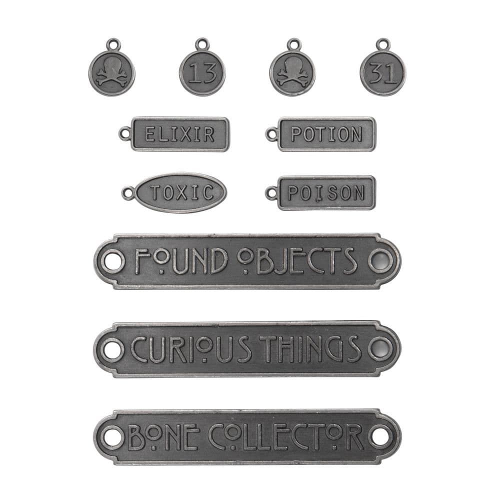 A collection of embossed metal tags and plaques, constructed of metal. 11 per pack - 7 word plaques and 4 tags.